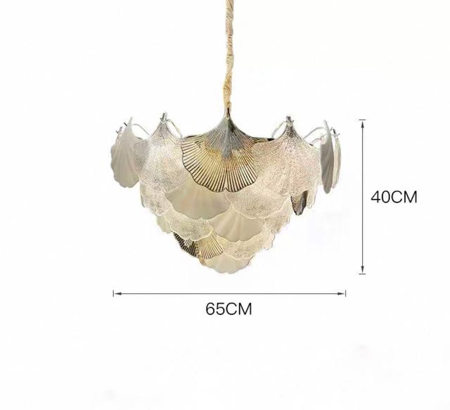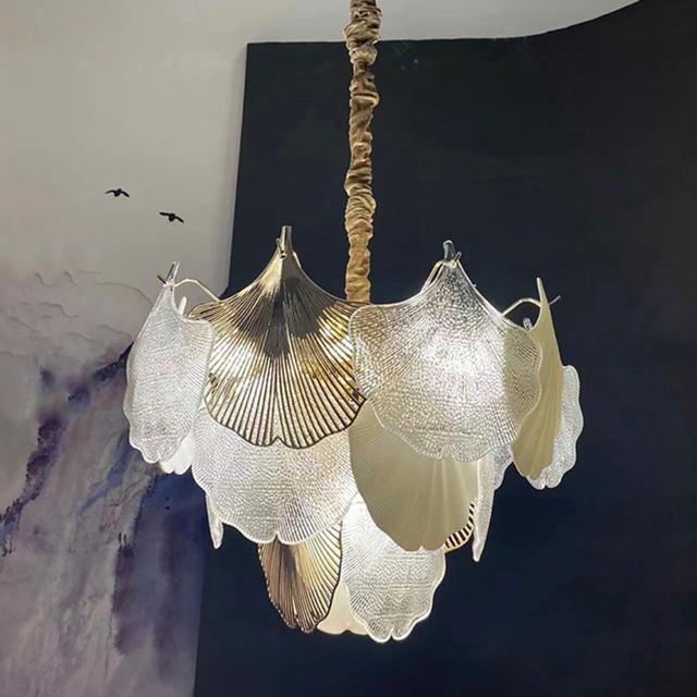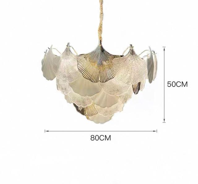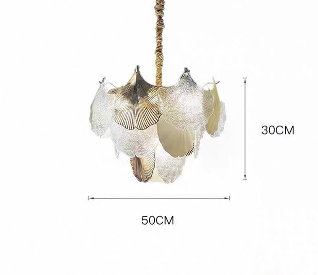 Серия люстр с многоярусным абажуром из подвесок в виде листьев гинкго из матового и прозрачного стекла. Обращайтесь за детальным подбором и консультацией