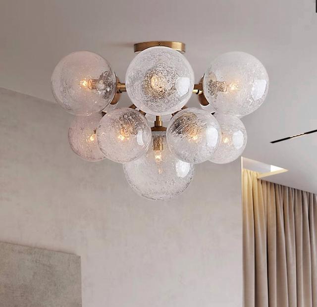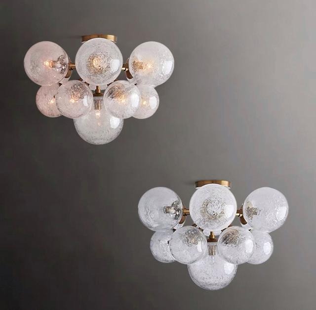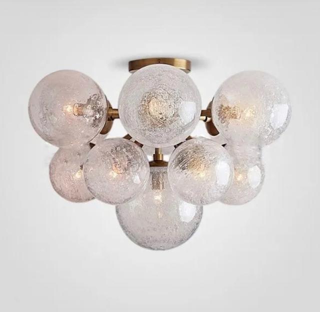 Потолочная люстра с шарообразными плафонами разного размера с эффектом воздушных пузырьков на латунном корпусе. Обращайтесь за детальным подбором и консультацией