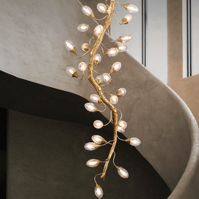Люстра с эллиптическими плафонами из стекла с эффектом воздушных пузырьков на вытянутом металлическом каркасе, стилизованном под дерево. Обращайтесь за детальным подбором и консультацией