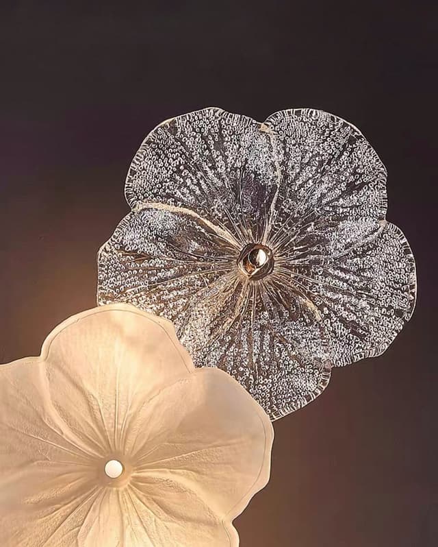 Нежная серия настенных светильников с цветочным декором из прозрачного и матового стекла ручной работы. Обращайтесь за детальным подбором и консультацией