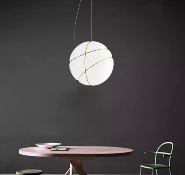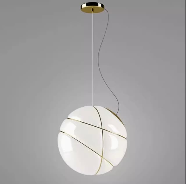 Подвесной светильник в виде шарообразного плафона из молочного стекла, обвитого золотой проволокой. Обращайтесь за детальным подбором и консультацией