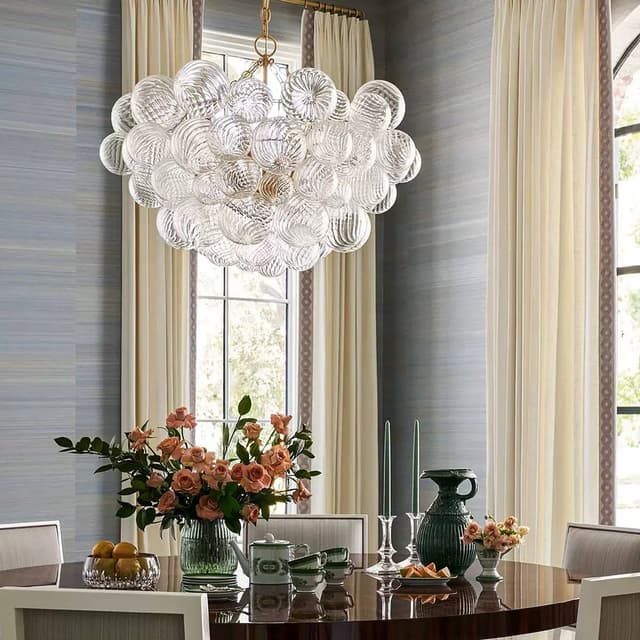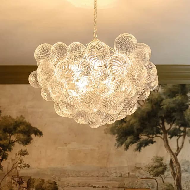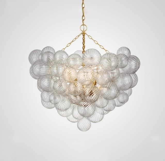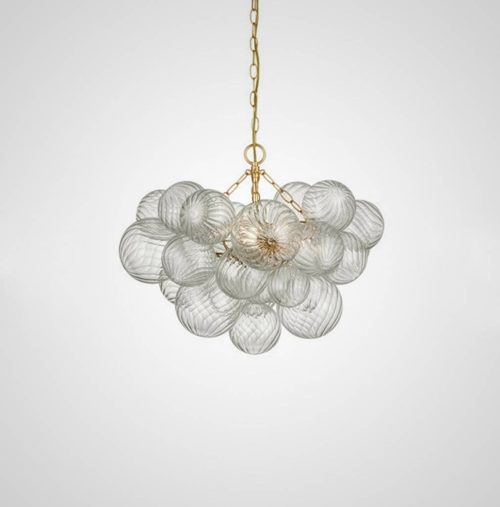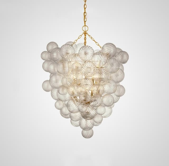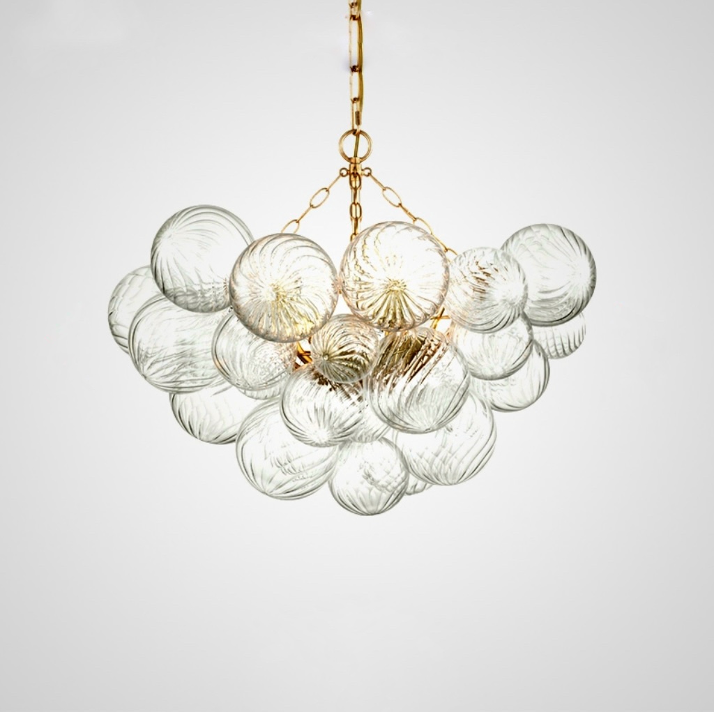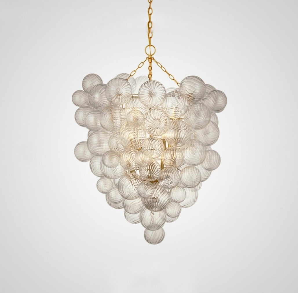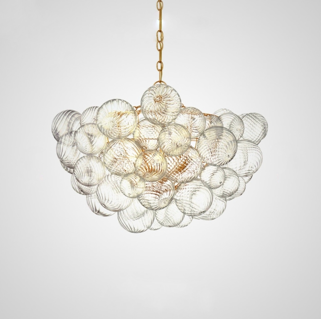 Серия люстр с декоративными шарами разного размера из рельефного стекла на латунном корпусе. Обращайтесь за детальным подбором и консультацией.
