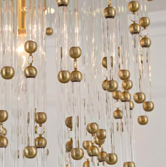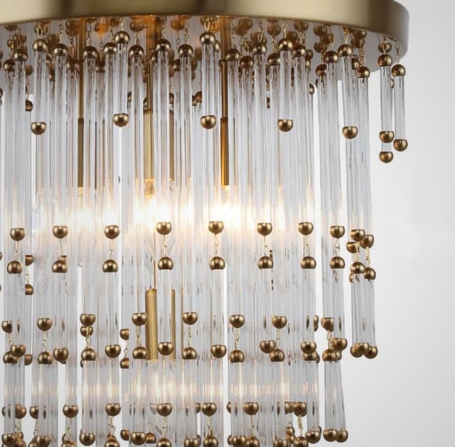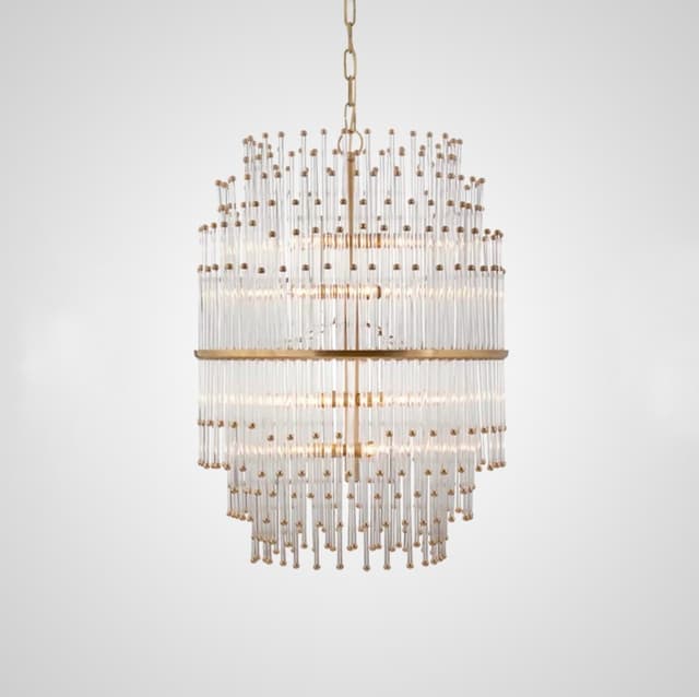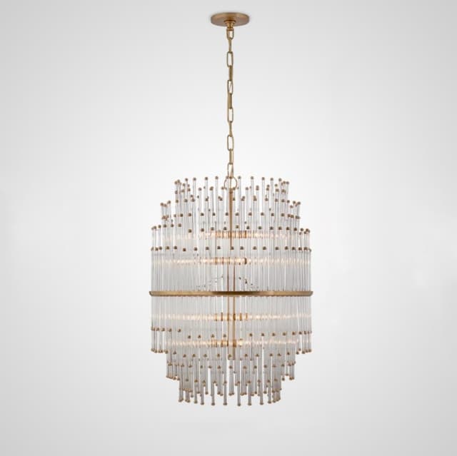 Люстра с составным многорядным абажуром из хрустальных стержней и металлических бусин. Обращайтесь за детальным подбором и консультацией.