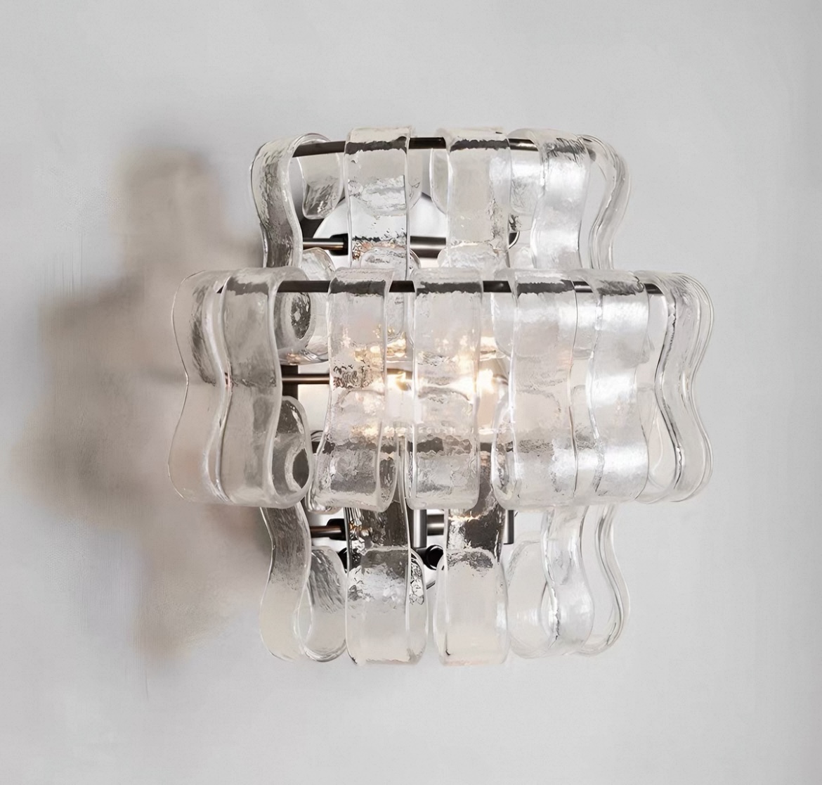 Серия настенных светильников с абажуром из стеклянных подвесок в форме разомкнутых звеньев цепи. Серия состоит из нескольких видов люстр и настенных светильников. Обращайтесь за детальным подбором и консультацией.